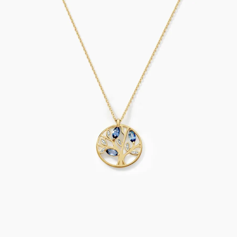 Collier Or Jaune 375/1000 Arbre De Vie Saphirs Formes Navettes 40+2cm