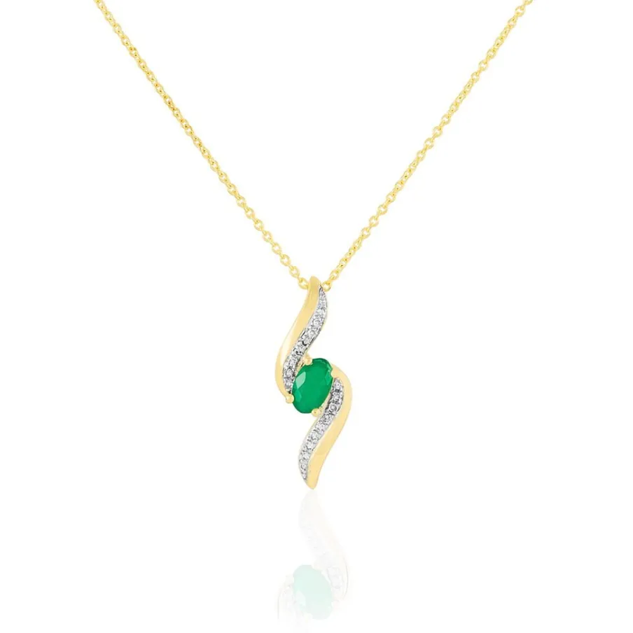 Collier Or Jaune 375/1000 Emeraude Incline Et Diamants 50cm
