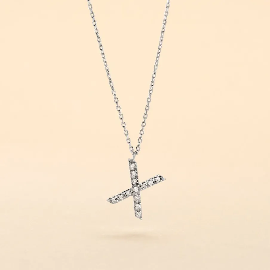 Collier Or Blanc 375/1000 Lettre X Pavage Diamants Maille Forçat 42cm