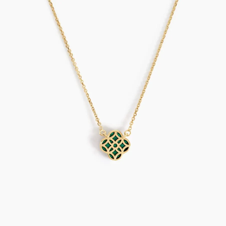 Collier Or Jaune 375/1000 Fleur Rosace Malachite Vert Maille Jaseron 40+2cm