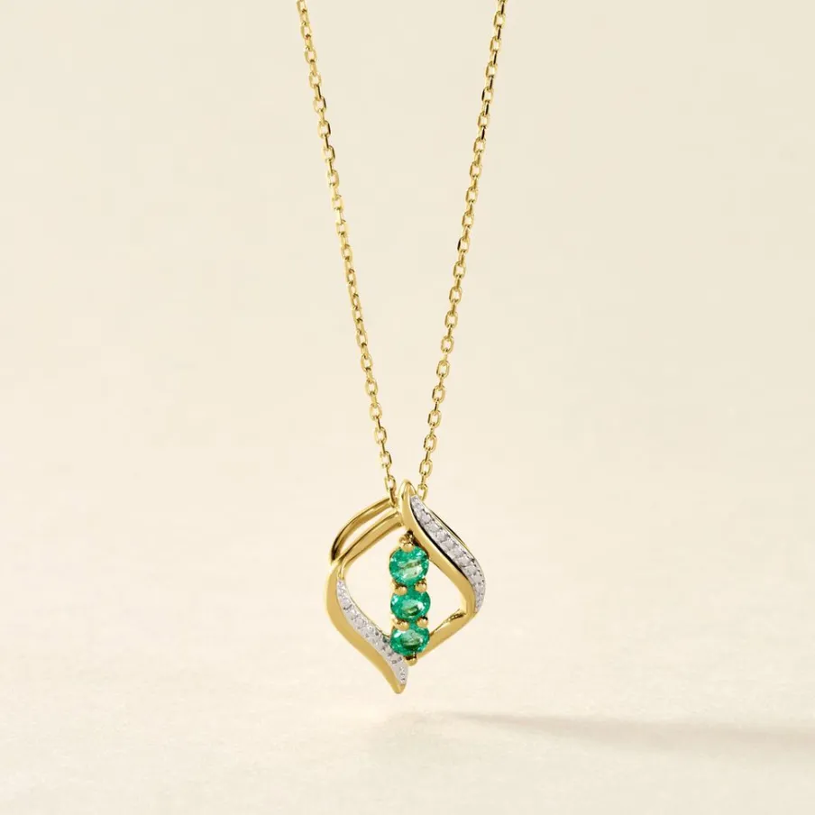 Collier Or Jaune Trilogie 375/1000 3 Emeraudes Vertes Accompagnés Diamants 42 Cm