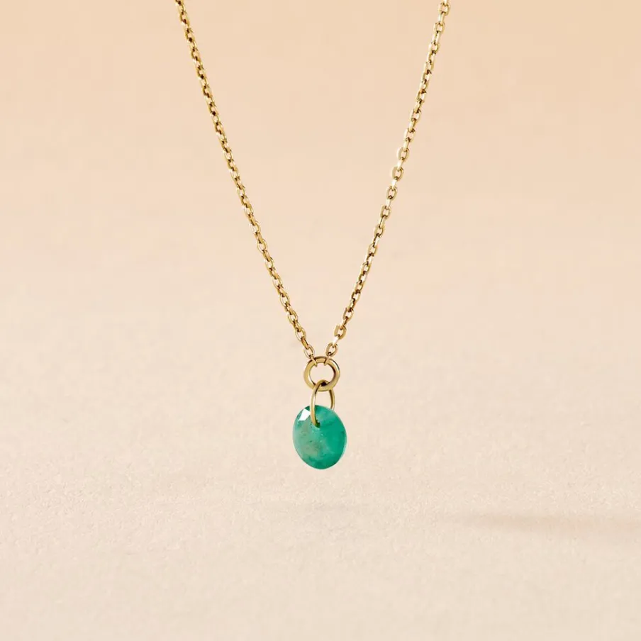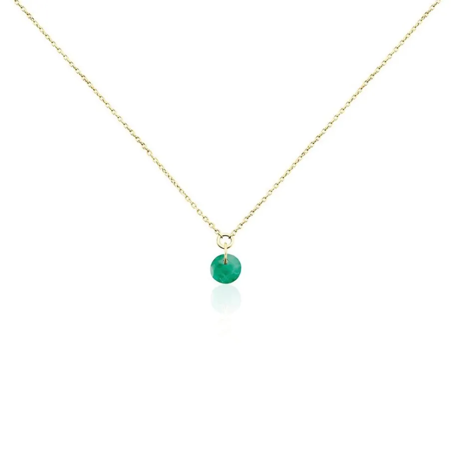 Collier Or Jaune 375/1000 Emeraude Rond 0.5 Cts Serti Percé Maille Forçat 42cm