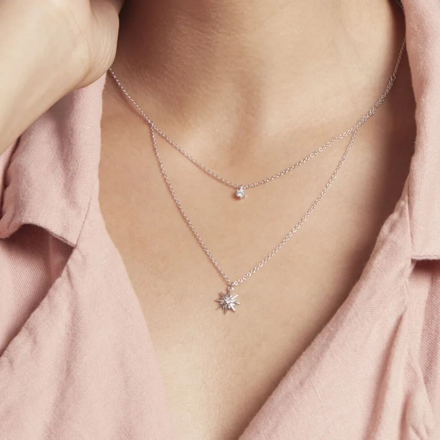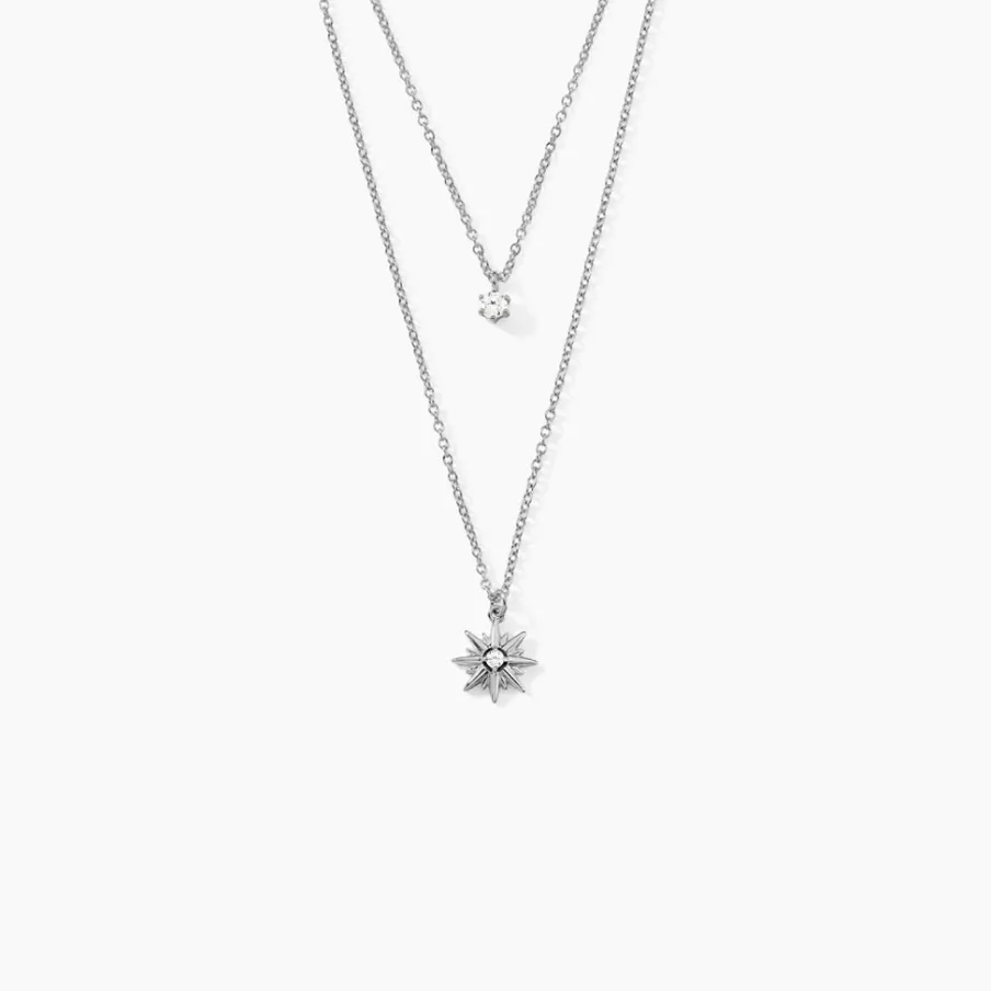 Collier Double Chaines Argent 925/1000 shone Motif Etoile Micro Setting Oxydes De Zirconium Maille Forçat 45cm