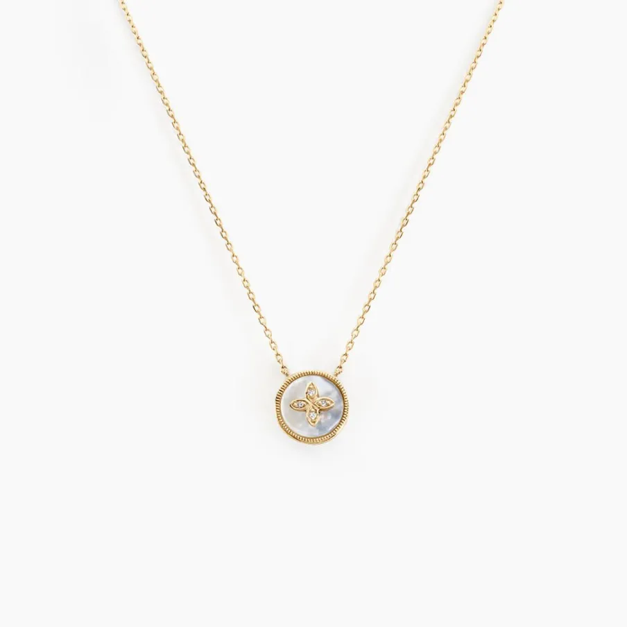 Collier Or Jaune 375/1000 Nacre Blanche Et Motif Fleur Diamants Maille Forçat 40+2cm