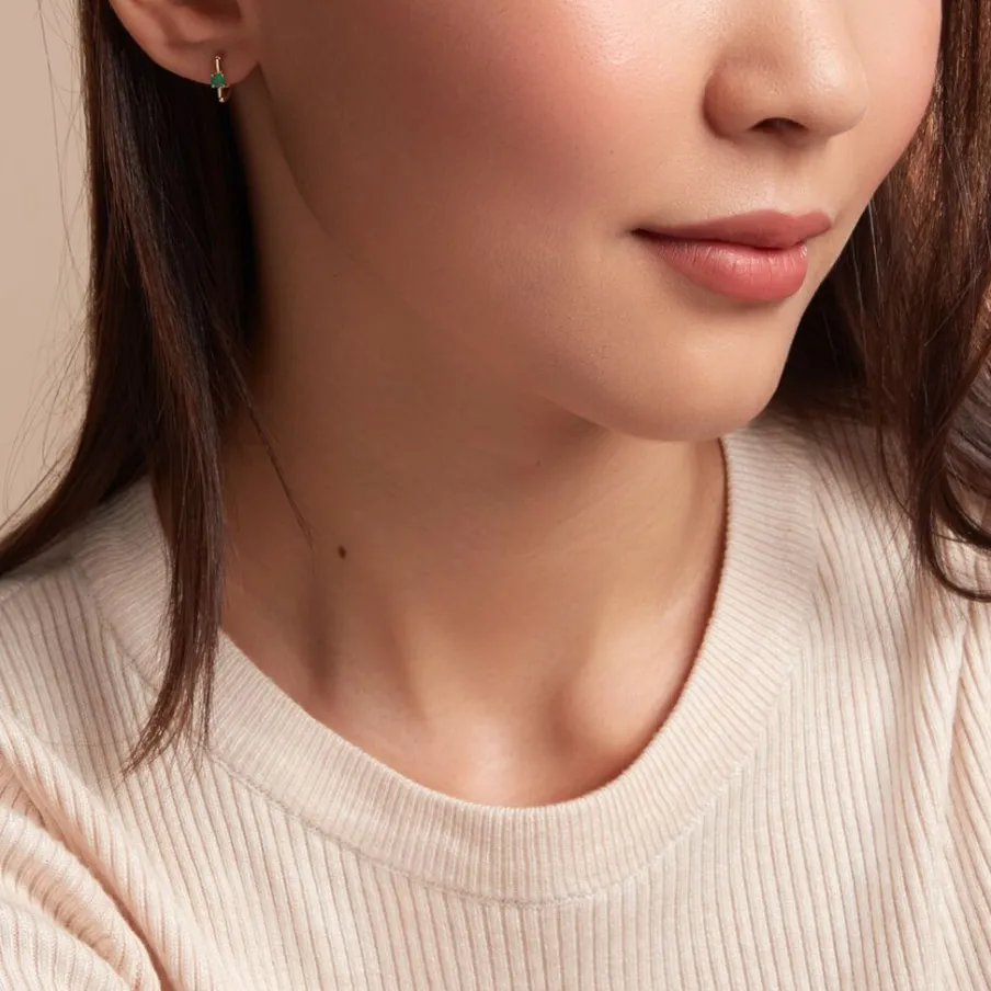 Creoles Or Jaune 375/1000 Carre Avec 1 Emeraude Ronde 0.24cts Serti Griffes