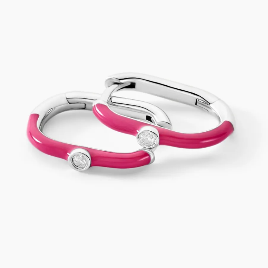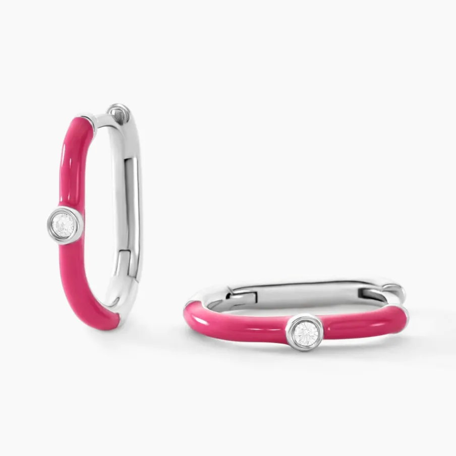 Créoles Argent Blanc 925/1000 Rectangulaires émail Rose Oxydes De Zirconium Serti Clos Diamètre 13*8mm