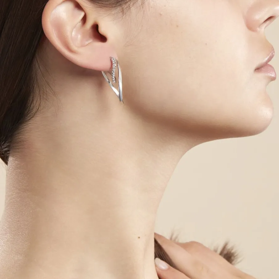 Créoles Or Blanc 375/1000 Deux Fils Carrés Dont Un Fil Avec Strass Largeur 2mm Diamètre 30x9mm