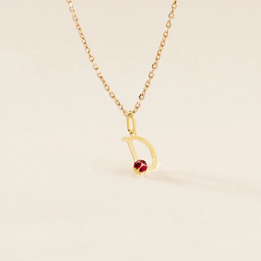Pendentif Or Jaune 375/1000 Lettre D Motif Coccinelle Email Noir Et Rouge