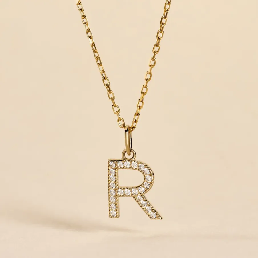 Pendentif Or Jaune 375/1000 Lettre R Oxydes De Zirconium