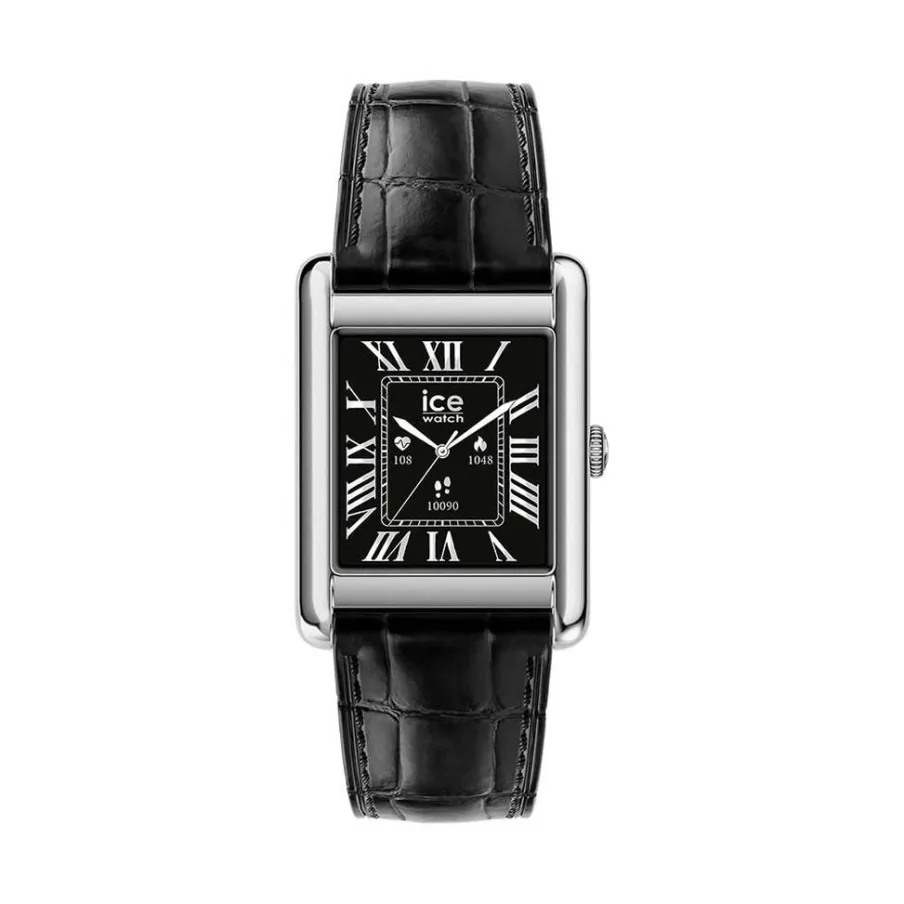 Montre Ice Watch Smart Tks 2.0 Alliage Argenté Connectee Rectangulaire 32Mm Fond Noir Bracelet Cuir D’Agneau Noir Effet Croco 025380