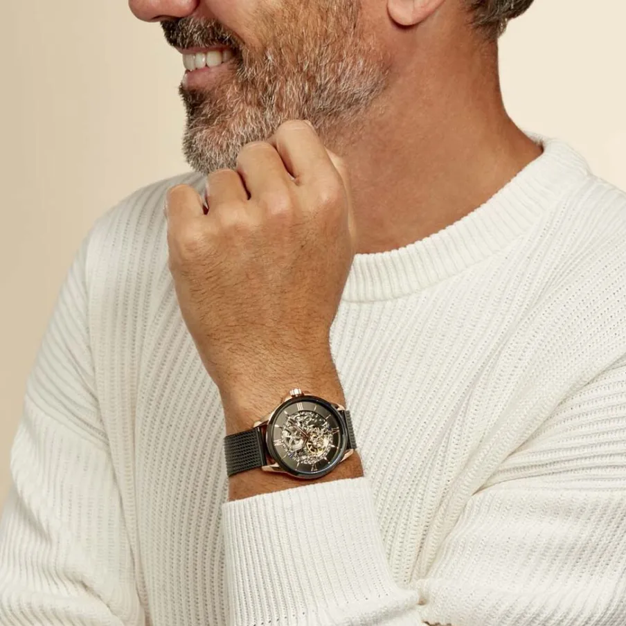 Montre Montignac Round Automatique Acier Dore Rose Ronde Automatique 42mm Fond Noir Bracelet Acier Noir Mow006