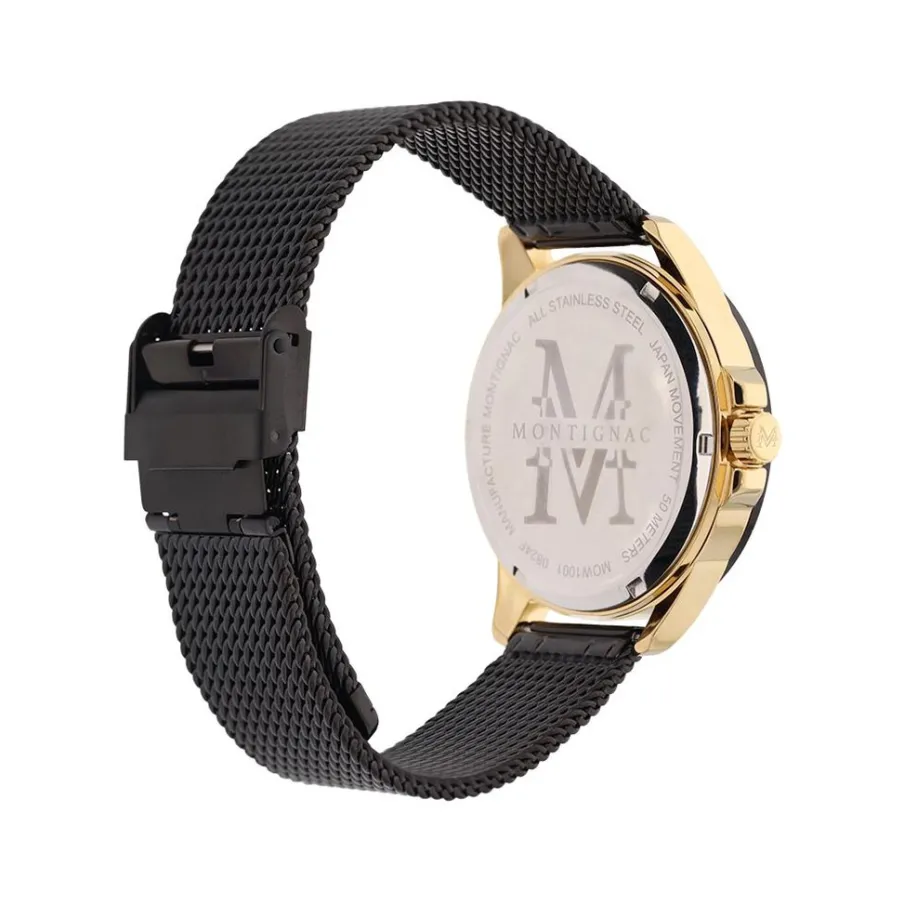 Montre Montignac Round Acier Dore Ronde Quartz 42mm Fond Vert Lunette Noire Bracelet Acier Noir Milanais Mow1001