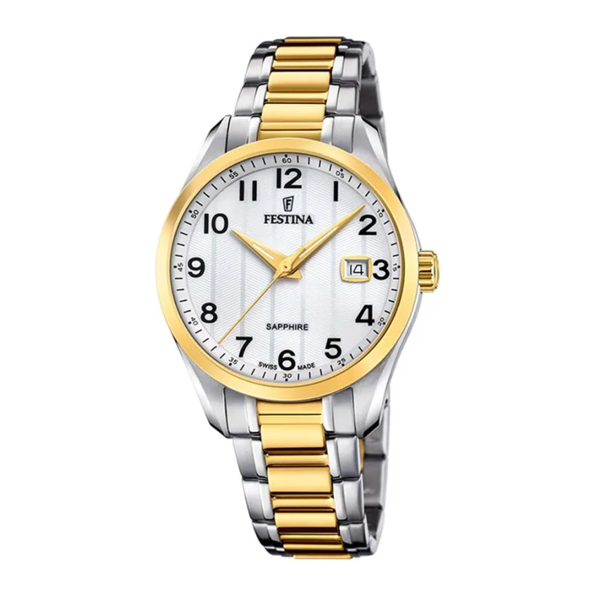 Montre Festina Swiss Made Acier Bicolore Dore Blanc Ronde Quartz 37.5mm Fond Argente Bracelet Acier Bicolore Dore Blanc F20027/1