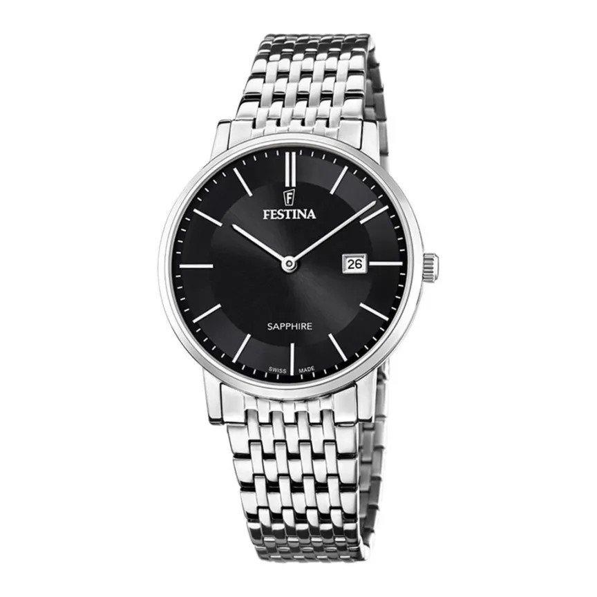 Montre Festina Swiss Made Acier Argente Ronde Quartz 39mm Fond Noir Bracelet Acier Argente F20018/3