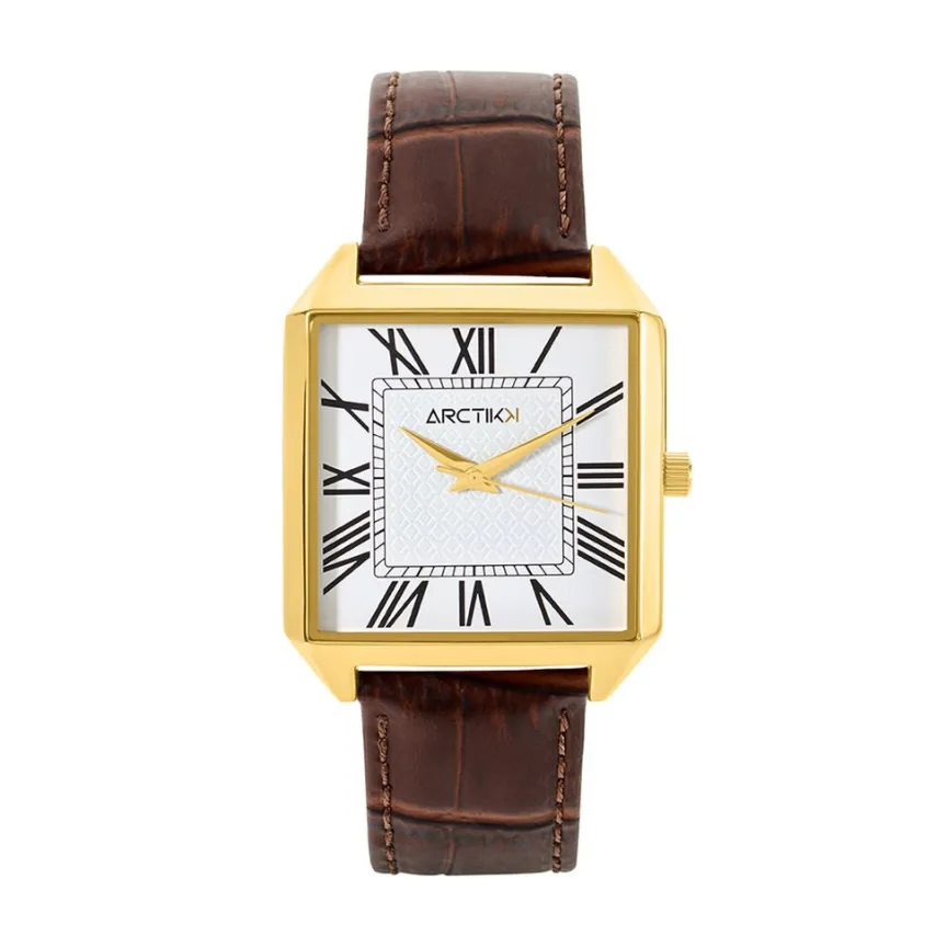 Montre Arctik Boitier Alliage Doré Fond Blanc Bracelet Cuir de vache Marron