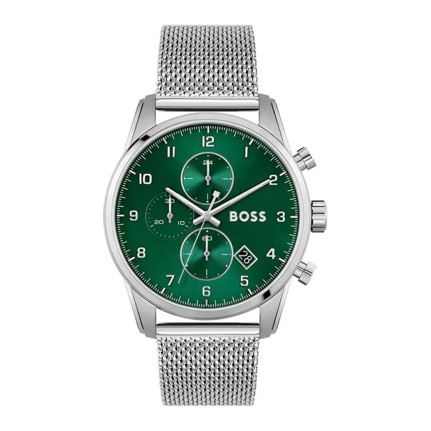 Montre Boss Skymaster Acier Blanc Ronde Quartz Chronographe 44mm Fond Vert Bracelet Acier Argenté 1513938