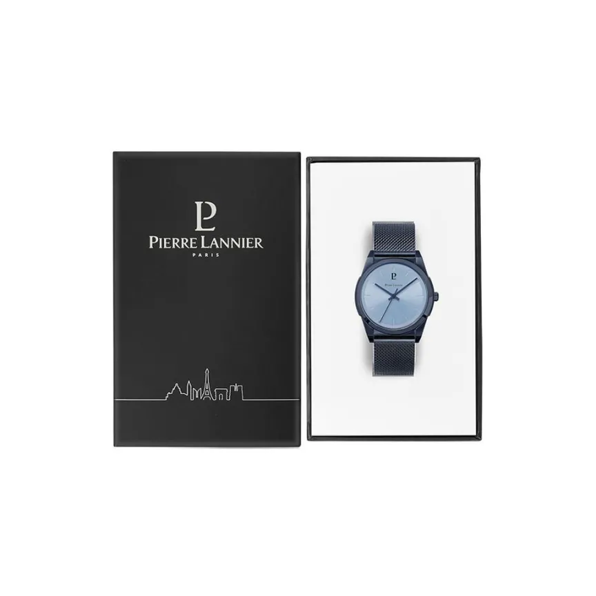 Montre Pierre Lannier Candide Acier Bleu Ronde Quartz 38mm Fond Bleu Bracelet Acier Maille Milanaise Bleu 214k469
