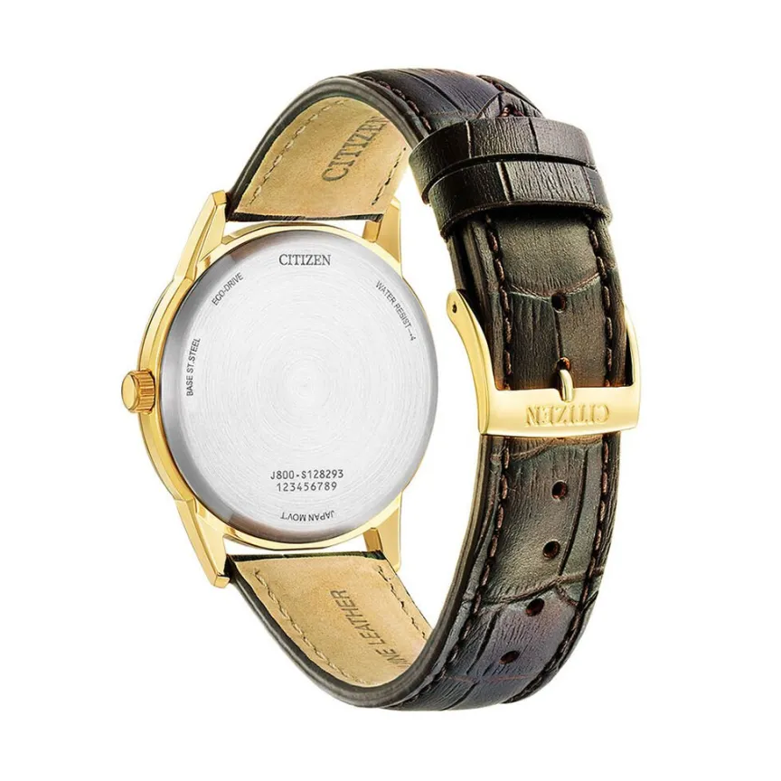 Montre Citizen Classic Elegant Acier Doré Ronde 40mm Quartz Solaire Fond Ivoire Bracelet Cuir De Veau Marron Aw0102-13ae