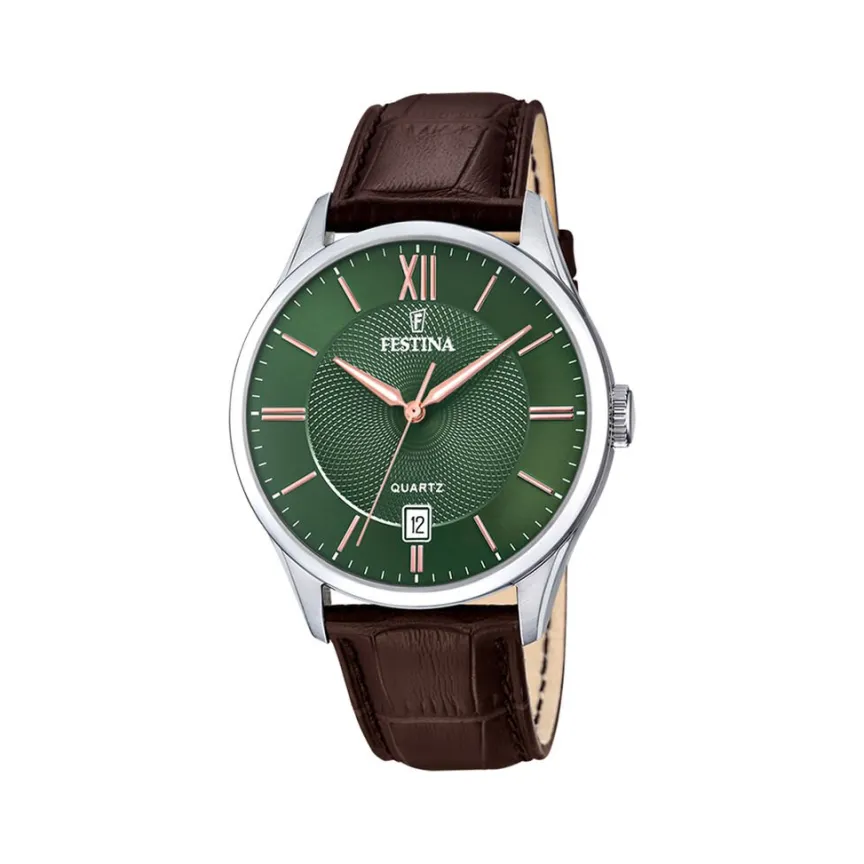 Montre Festina Classics Acier Inoxydable Argenté Quartz Ronde 43Mm Fond Vert Bracelet Cuir De Vache Effet Croco Marron F20426/8