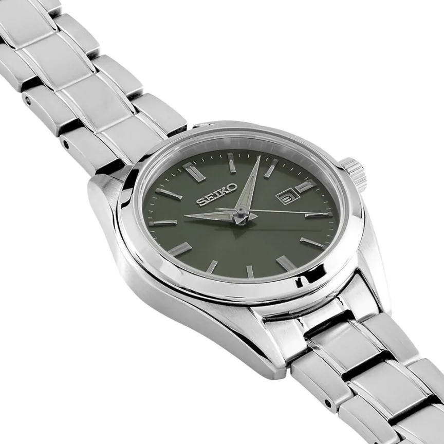 Montre Seiko Classique Acier Argenté Ronde Quartz 29.8mm Fond Kaki Bracelet Acier Argenté 10atm Sur533p1