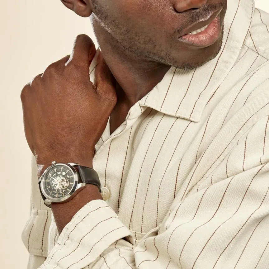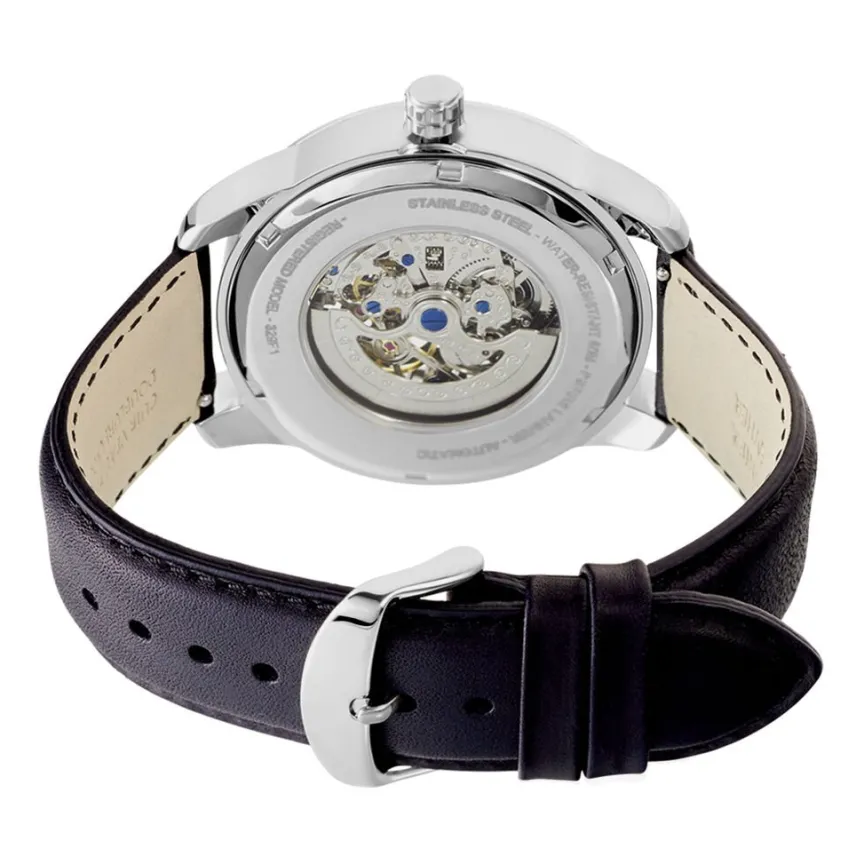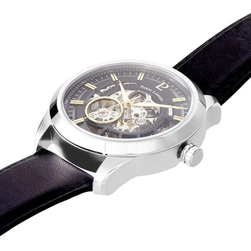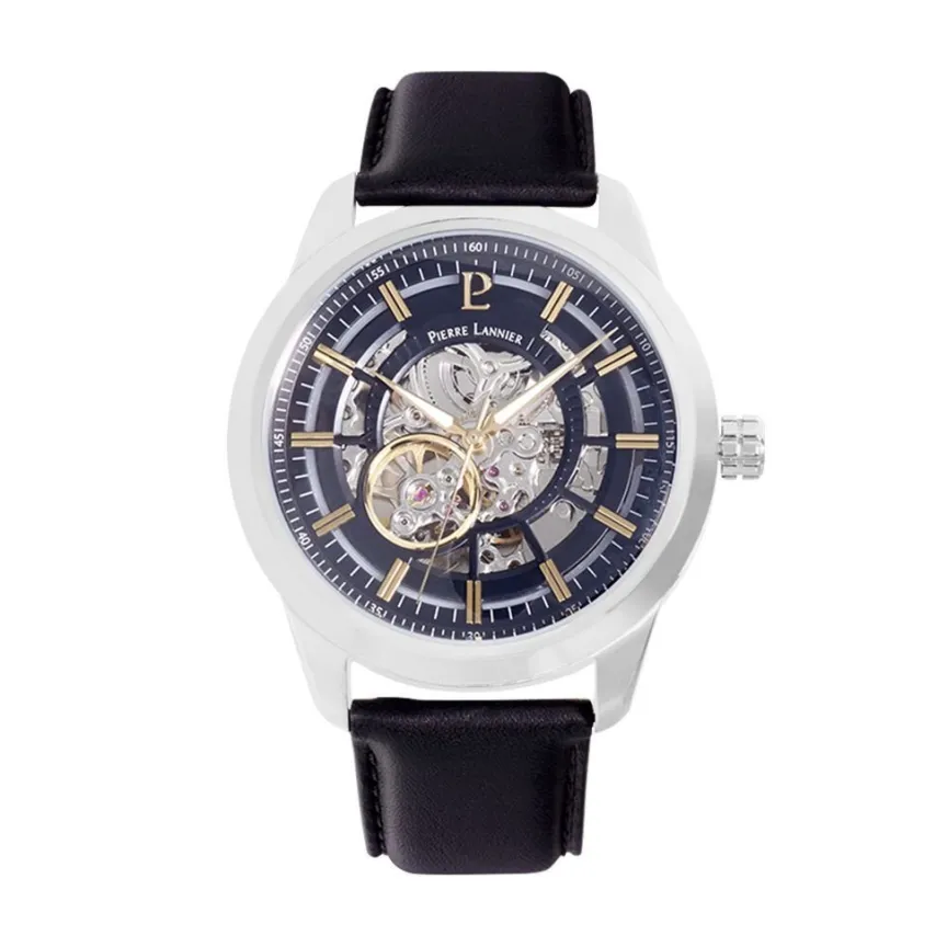 Montre Pierre Lannier Collection Automatique Acier Argenté Ronde Automatique 44mm Fond Noir Bracelet Cuir Noir 329f133
