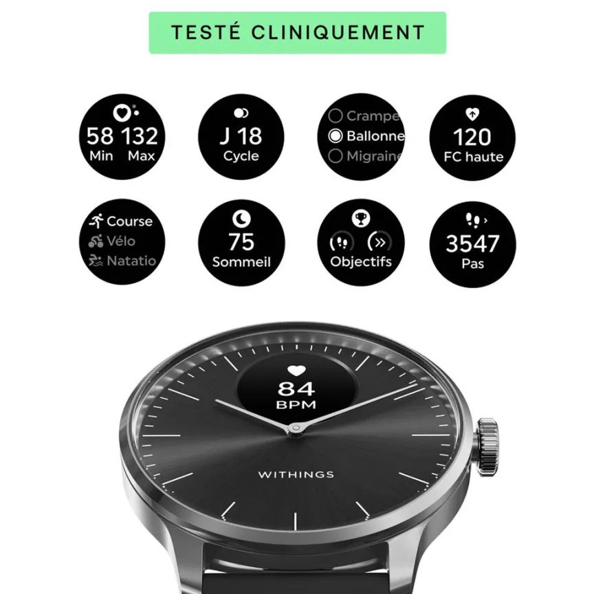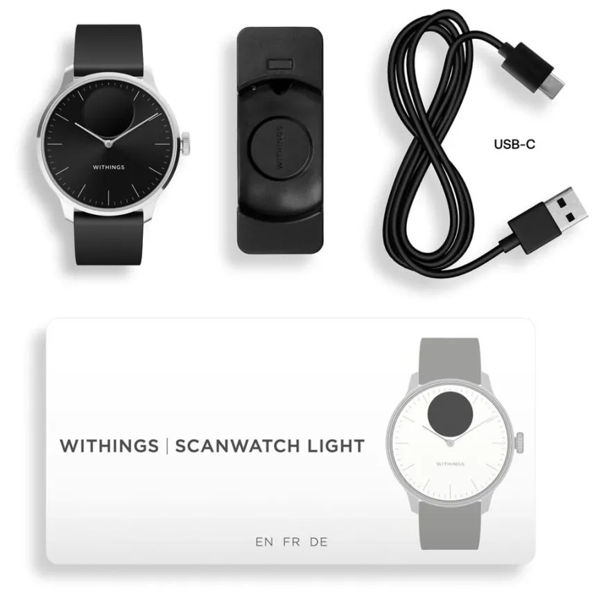Montre Withings Scanwatch Light Acier Inoxydable Argente Ronde Connectee 37mm Fond Noir Bracelet Silicone Noir Wswlblack
