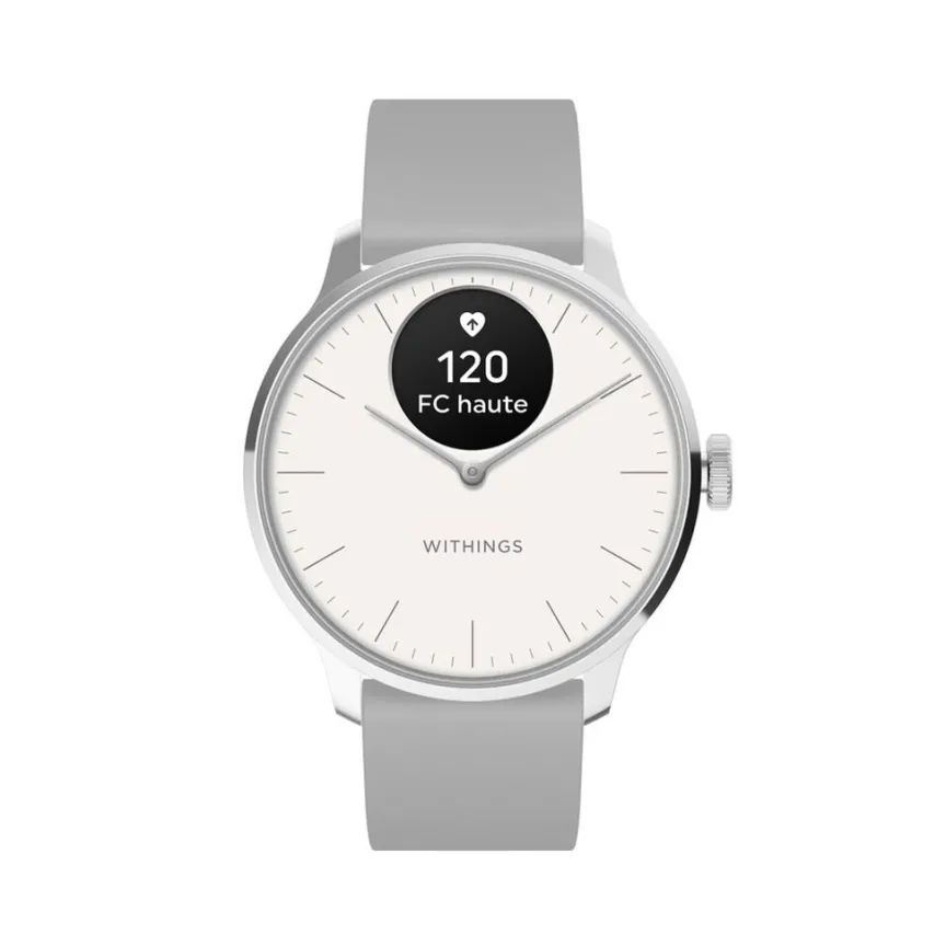 Montre Withings Scanwatch Light Acier Inoxydable Argente Ronde Connectee 37mm Fond Blanc Bracelet Silicone Gris Wswlwhite