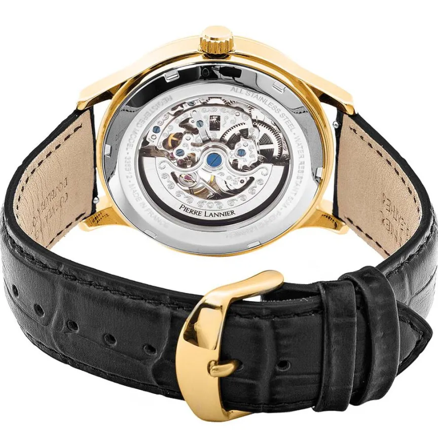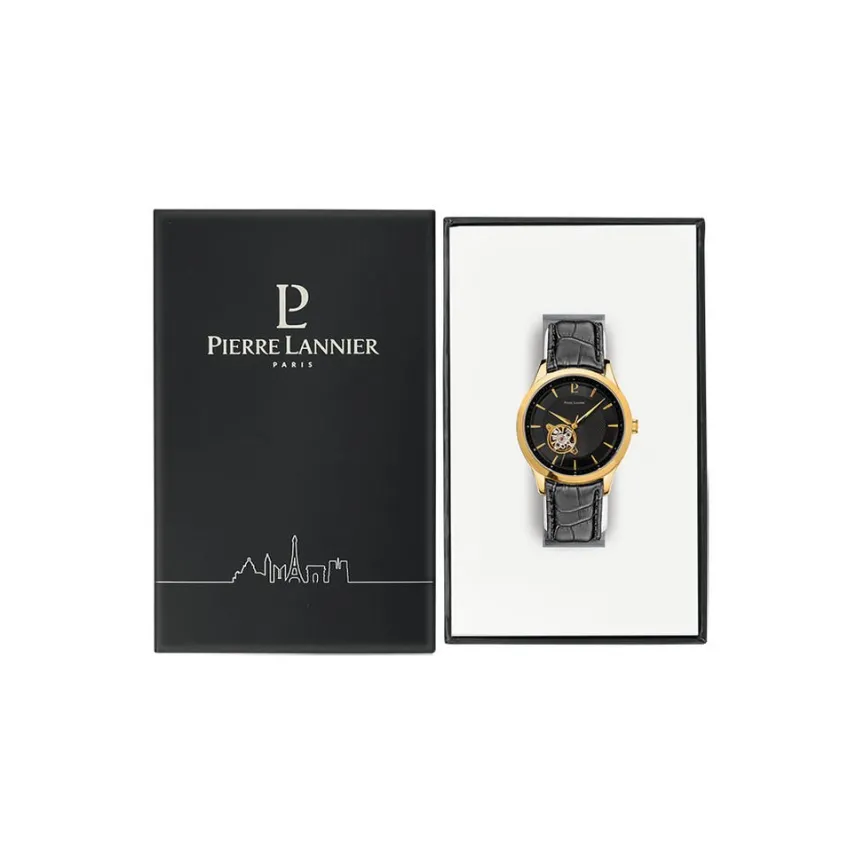 Montre Pierre Lannier Fleuret Acier Doré Ronde Automatique 42.5mm Fond Noir Bracelet Cuir Noir 336b033