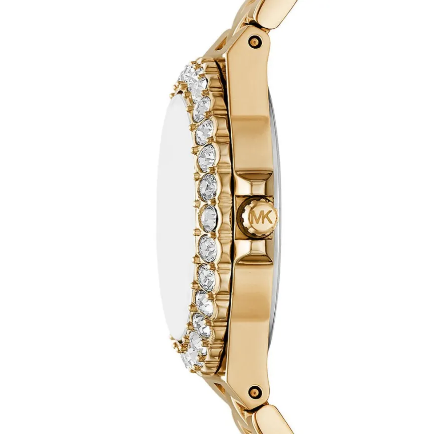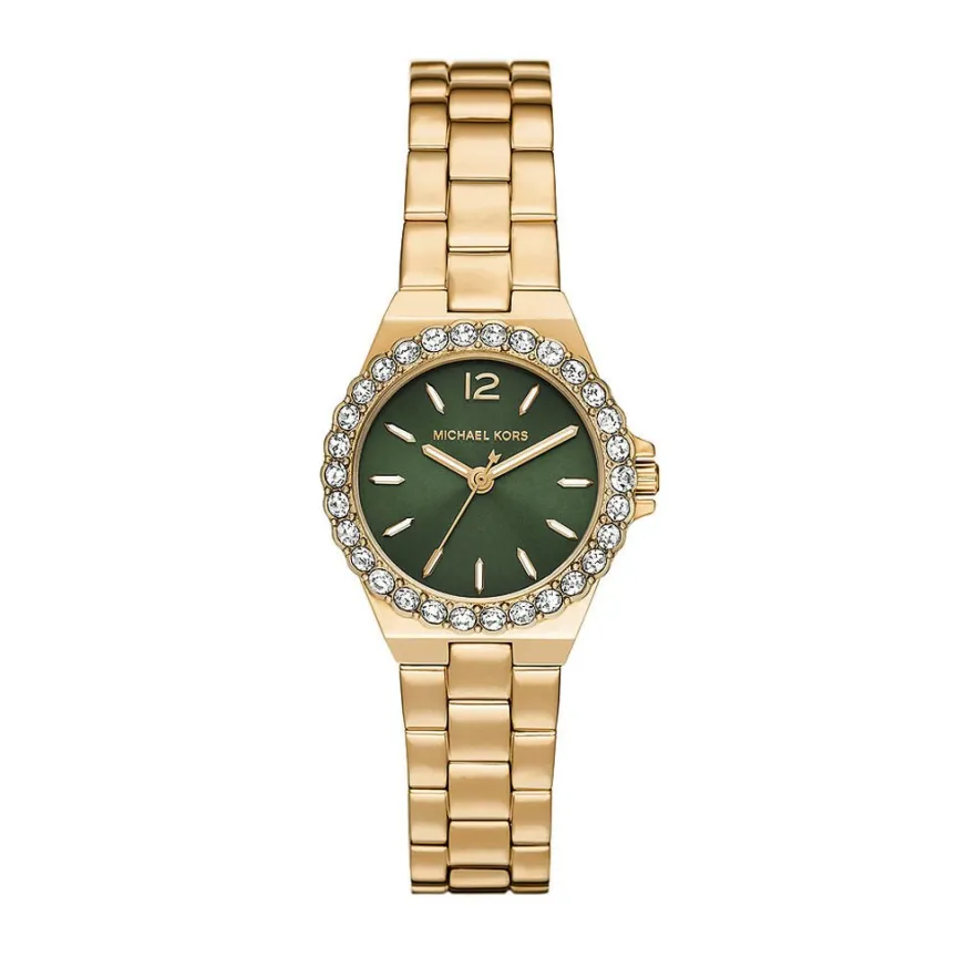 Montre Michael Kors Lennox Acier Dore Rond Quartz 30mm Lunette Strassee Fond Vert Bracelet Acier Dore Mk7395
