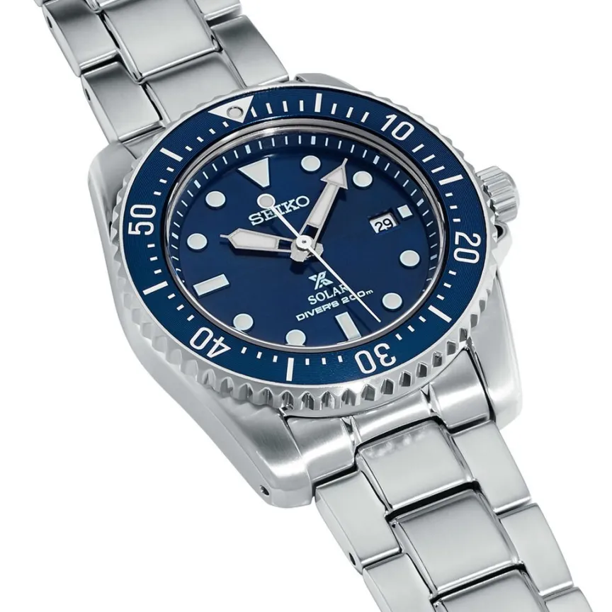 Montre Seiko Prospex Acier Blanc Ronde Quartz Solaire 38.5mm Fond Bleu Lunette Aluminium Bleue Bracelet Acier Blanc Sne585p1