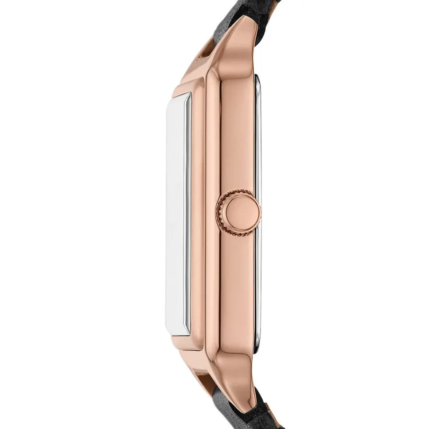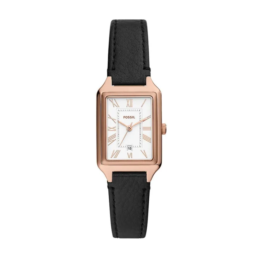 Montre Fossil Raquel Acier Rose Rectangulaire Quartz 23mm Fond Blanc Bracelet Cuir Noir Es5310