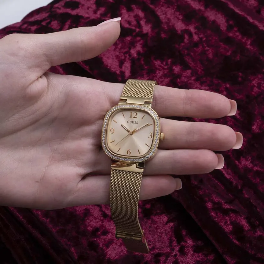 Montre Guess Tapestry Acier Doré Carrée Quartz 32mm Fond Doré Lunette Strass Bracelet Acier Maille Milanaise Doré Gw0354l2