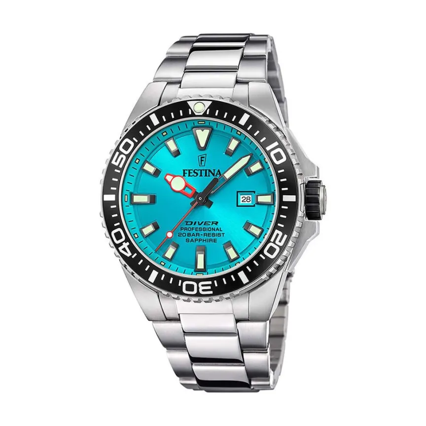 Montre Festina The Originals/diver Acier Argente Ronde Quartz 46mm Lunette Noire Fond Bleu Sky Bracelet Acier Argente F20663/5