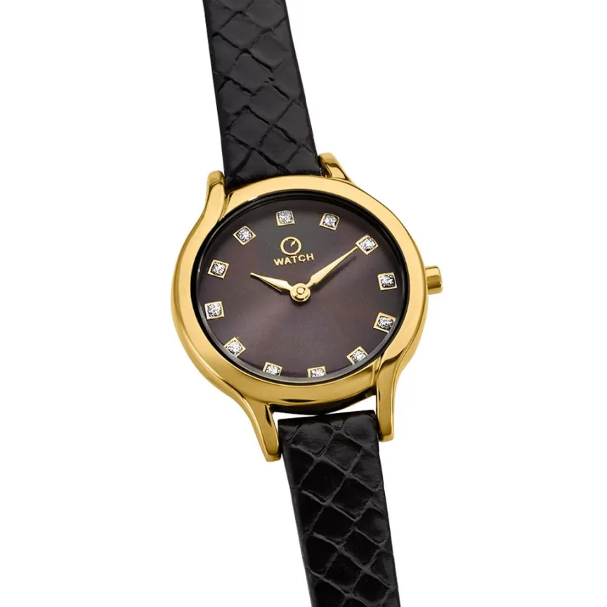 Montre O Watch Tiny Alliage Doré Ronde Quartz 26.5mm Fond Noir Bracelet Synthétique Noir P100851-ai