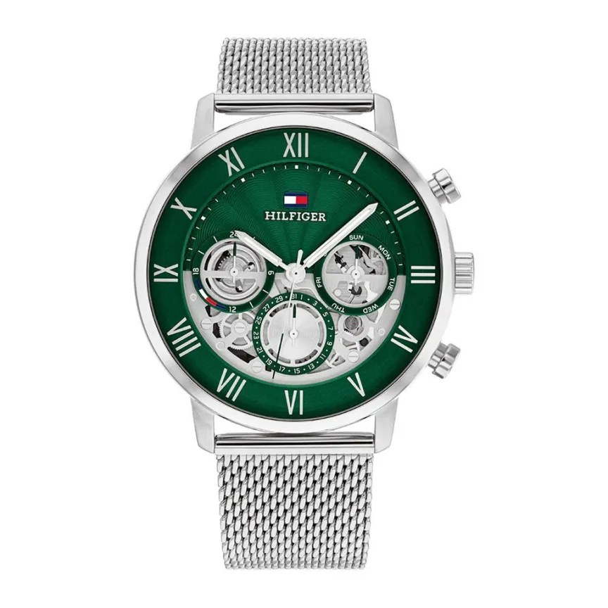 Montre Tommy Hilfiger Acier Argente Rond Quartz Multifonction 44mm Fond Vert Bracelet Acier Milanais Argente 1710567