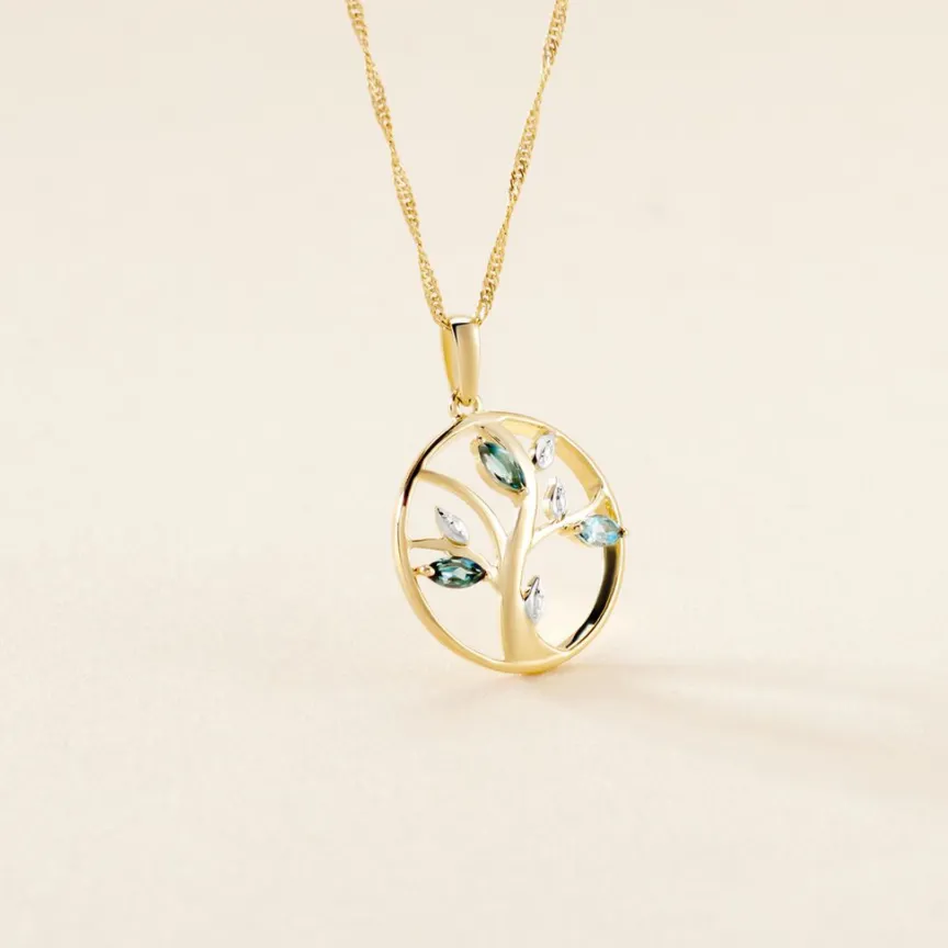 Pendentif Or Jaune 375/1000 Arbre De Vie Topazes London Blue Formes Navettes