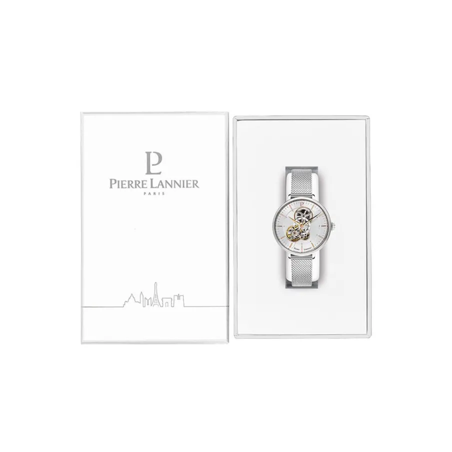Montre Pierre Lannier Melodie Acier Blanc Ronde Automatique 37mm Fond Argenté Bracelet Acier Blanc Maille Milanaise 348a621