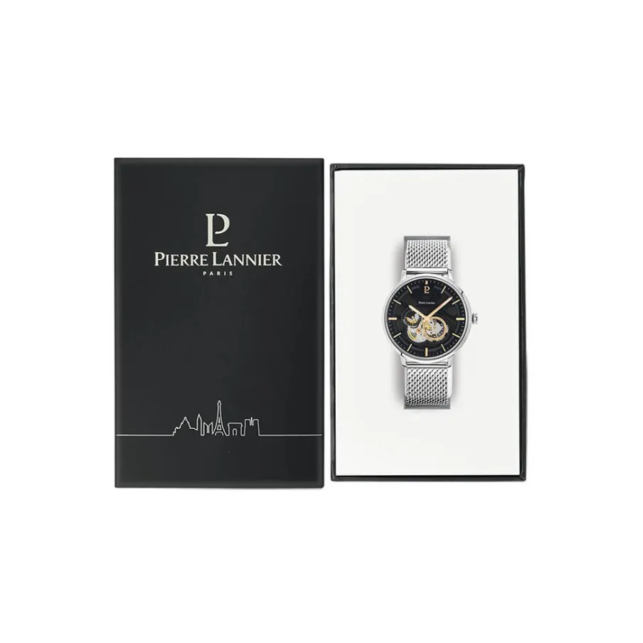 Montre Pierre Lannier Trio Acier Blanc Ronde Automatique 42mm Fond Noir Bracelet Acier Blanc Maille Milanaise 334b131