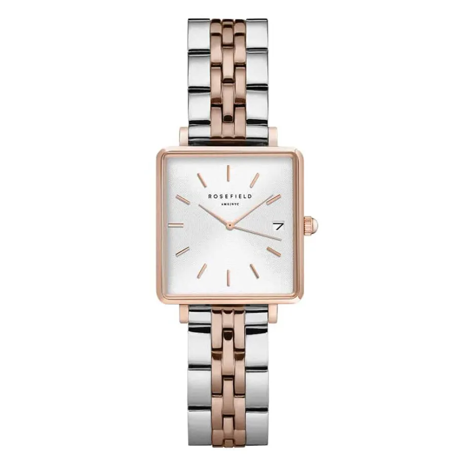 Montre Rosefield Boxy Xs Acier Doré Rose Carré Quartz 22x24mm Fond Blanc Bracelet Acier Bicolore Qmwssr-q024
