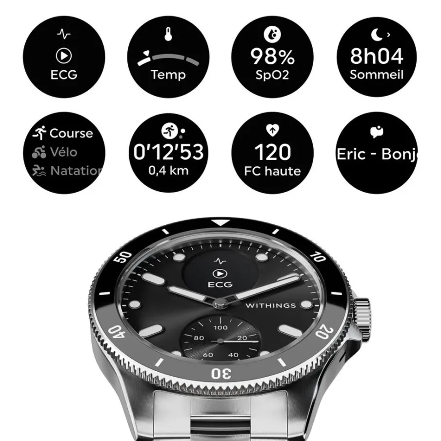 Montre Withings Scanwatch Nova Acier Inoxydable Ronde Argente Connectee 42mm Fond Noir Bracelet Acier Inoxydable Argente Wswnblack